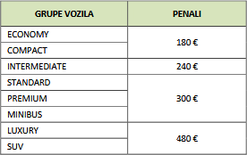 Europcar zadržava pravo dodatne naplate penala za neovlašćenu vožnju u slučajevima kada je to dokazano, a po tabeli ispod (vrednosti su bez PDV-a). Ovaj penal ne zavisi od eventualnog štetnog događaja na vozilu i nije vezan za to.